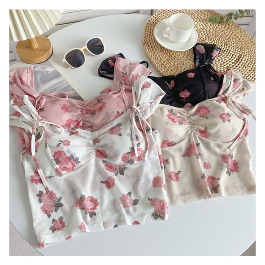 Bustier-Crop-Top mit Flügelärmeln, V-Ausschnitt, Blumendruck