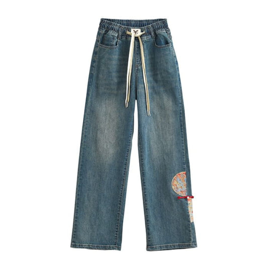 Jeans mit verwaschenem Schnitt und Stickereien im Kordelzugbund