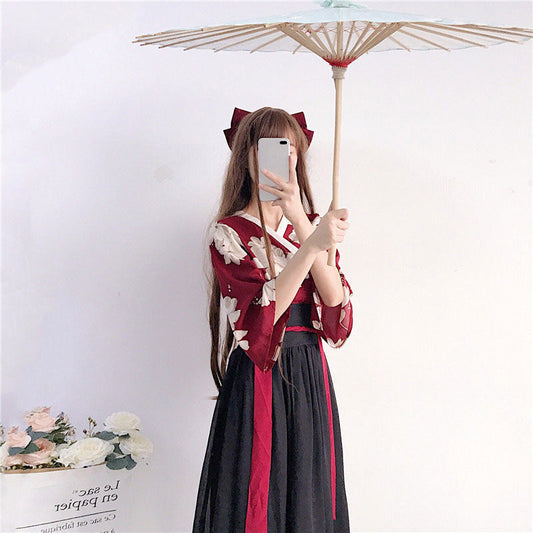 Blumenrotes schwarzes Hanfu-Kostümset