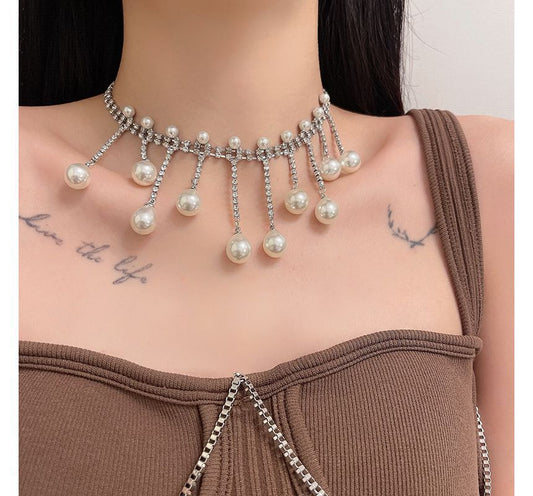Fringed Rhinestone Pearl Choker Faux Alloy
