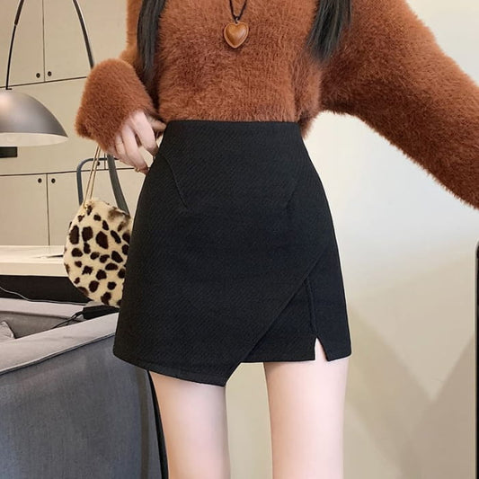 Hochgeschnittener, schlichter, asymmetrischer Minirock in A-Linie mit Schlitz