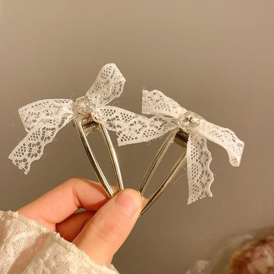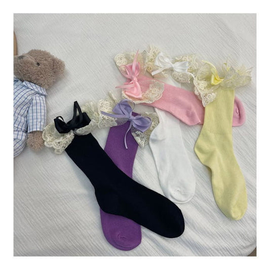 Lace Blouse Crew Neck Puff-Sleeve Trim Bow Accent