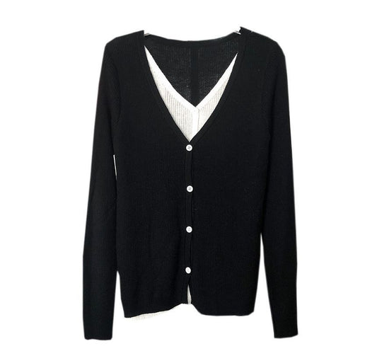 Mock Button-Up Two-Piece V-Neck Two Top Knit Tone Long-Sleeve