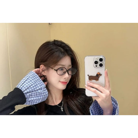 Mock Two-Piece Long-Sleeve Plaid Hem Top
