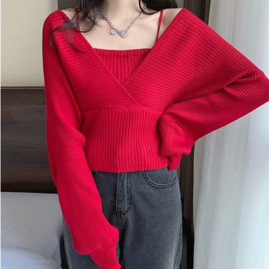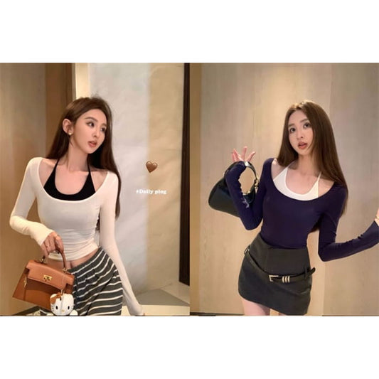 Mock Two-Piece Long-Sleeve Cold Shoulder Plain Knit Top