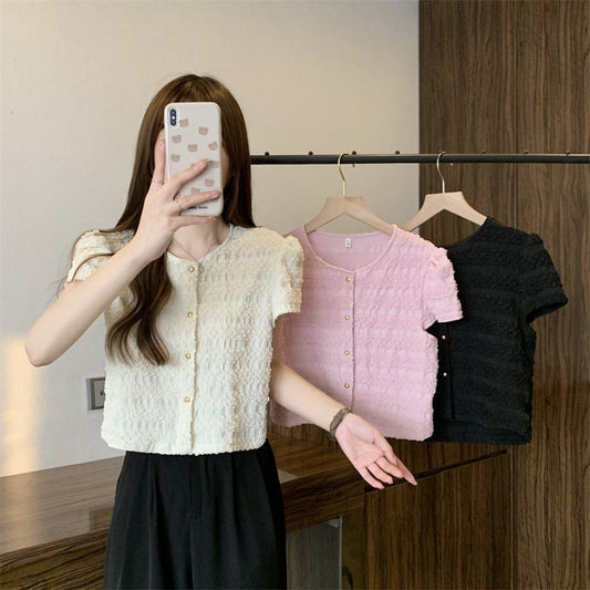 Round Plain Neck Frill Top Short-Sleeve Button