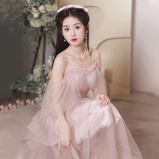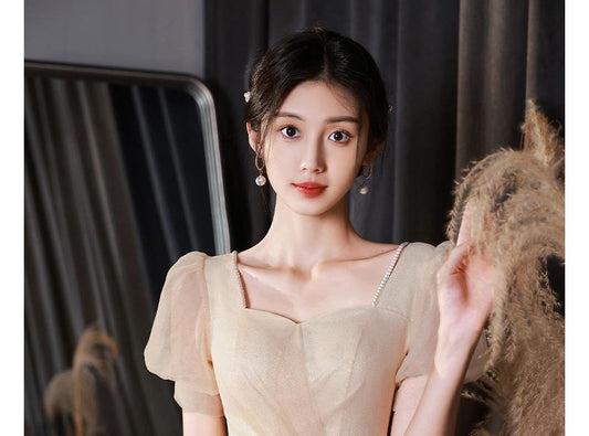 Puff Sleeve Square Neck Plain Faux Pearl Ruched Mesh A-Line Evening Gown / Midi Cocktail Dress
