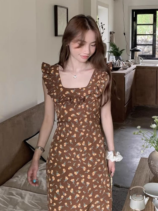 Ruffle Sleeveless V-Neck Floral Print Maxi A-Line Dress