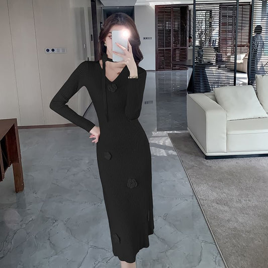 Long Sleeve V-Neck Rhinestone Plain Ribbed Knitted Midi Bodycon Dress