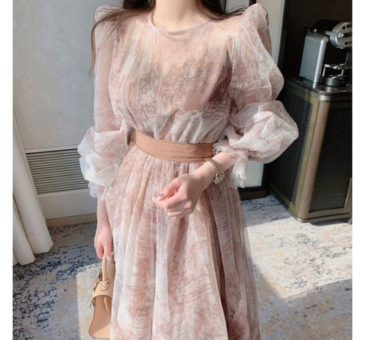 Puff-Sleeve Printed Midi A-Line Organza Dress
