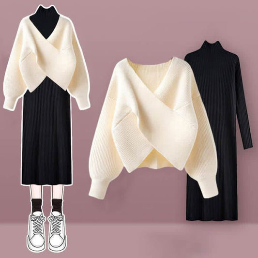 Set aus Unterkleid mit Kreuzstrickpullover und unregelmäßiger Schnürung