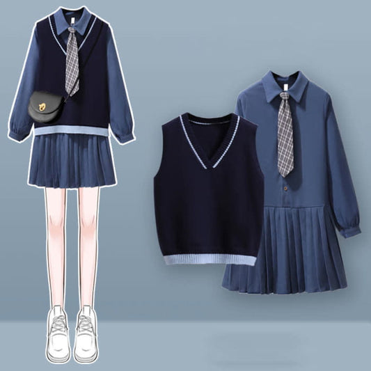 Preppy-Stil Strickweste Revers Krawatte Plissee Hemdkleid Set