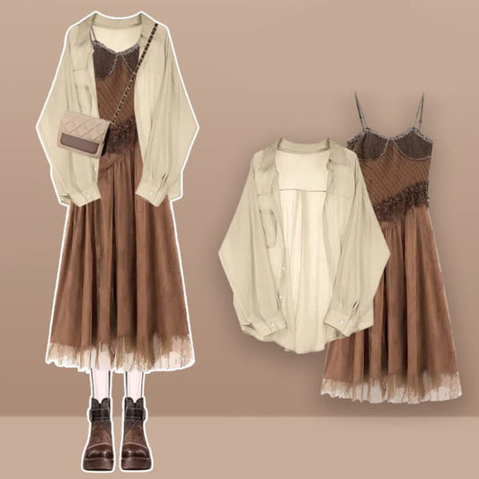 Vintage Hollow Coverup Rückenfreies Hosenträgerkleid Braune Strickjacke