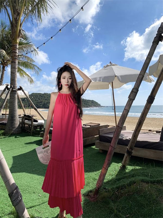 Pleated Accordion A-Line High Waist Maxi Plain Skirt