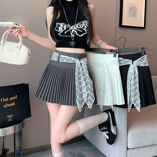 Pleated A-Line Bow Low Skirt Trim Lace Mini Pinstriped Waist