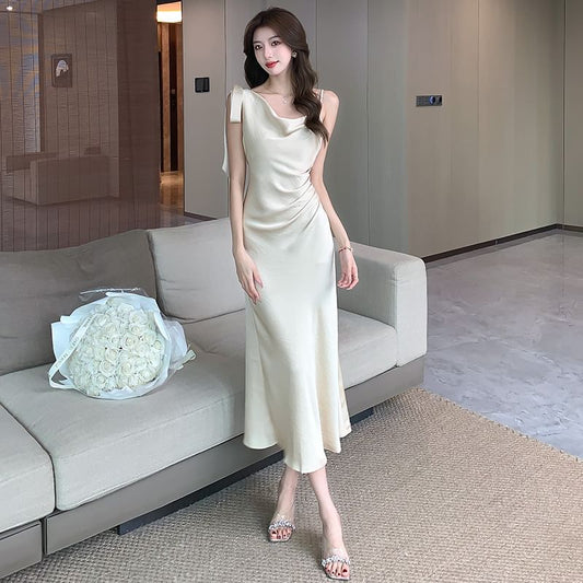 Satin Sleeveless Midi Plain Asymmetrical Cowl Ruched Dress Mermaid Neck