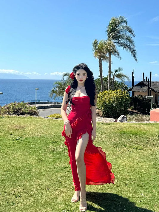 Open Sleeveless Plain Neck Square Dress Back Slit Bodycon Trim Ruffle Maxi