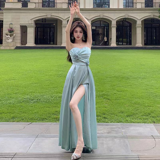 Side-Slit Strapless Dress A-Line Plain Maxi