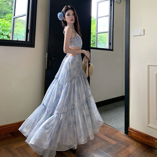 Rise Halter Back V-Neck Asymmetrical + Open Top A-Line Plain Skirt Set: High Ruffle Layered