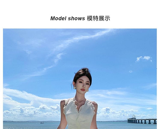 Ruffle Dress Plain A-Line V-Neck Maxi Front-Slit Halter