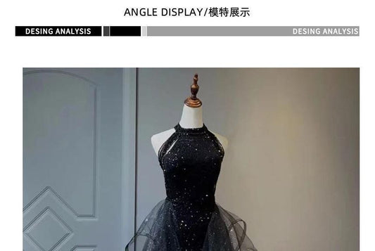Sleeveless Plain Mesh Gown Beaded Glitter Ruffle Neck Panel A-Line Crew Evening