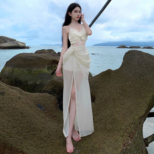 Spaghetti Slit Lace Dress Strap Sheath Panel Knot Maxi