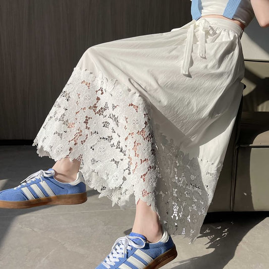 Waist Midi Lace High Skirt A-Line Plain Panel