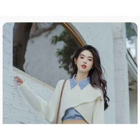 Langärmliges, schlichtes bauchfreies Top / gestreiftes Hemd / Maxi-Faltenrock in A-Linie mit hoher Taille / Set