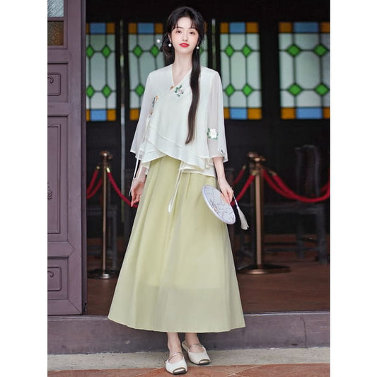 Besticktes Oberteil mit 3/4-Ärmeln und V-Ausschnitt / Maxirock in A-Linie mit hoher Taille