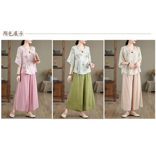 Set: Wickeloberteil mit V-Ausschnitt und Blumenmuster mit Ellenbogenärmeln und Bindeband vorn + einfarbige Hose mit weitem Bein und hoher Taille
