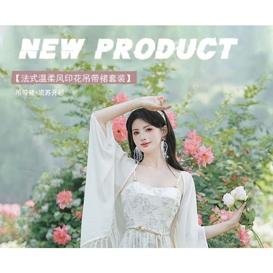Midi-A-Linien-Kleid mit Spaghettiträgern und Print / Jacke vorne offen / Set