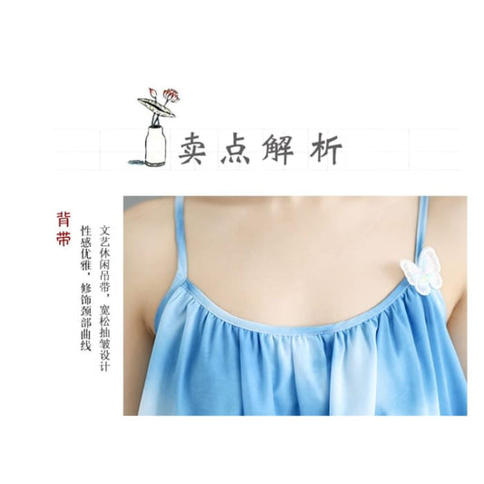 Maxi-A-Linien-Kleid mit Spaghettiträgern, Batikmuster, Schmetterlingsdetail und Raffung
