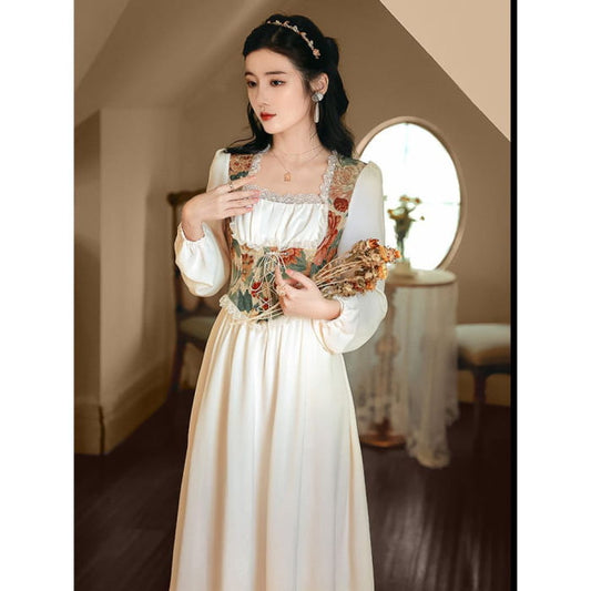 Zweiteiliges Midikleid mit Blumenmuster, Puffärmeln und Schnürung