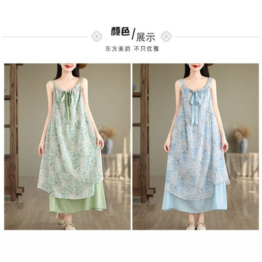 Ärmelloses Maxi-A-Linien-Kleid mit V-Ausschnitt, gemustertem Druckeinsatz und Bindeband vorn