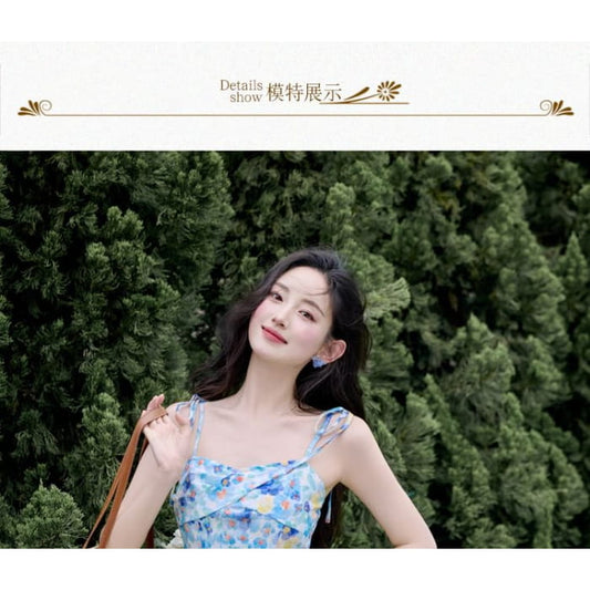 Midi-A-Linien-Kleid mit Spaghettiträgern und Blumendruck / schlichte Strickjacke / Set