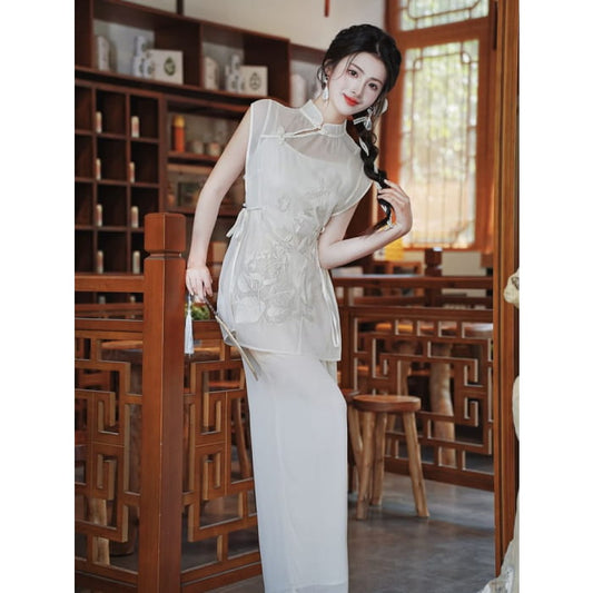 Set: Ärmelloses, besticktes Oberteil mit Stehkragen + Camisole-Oberteil + einfarbige Hose mit weitem Bein und hoher Taille
