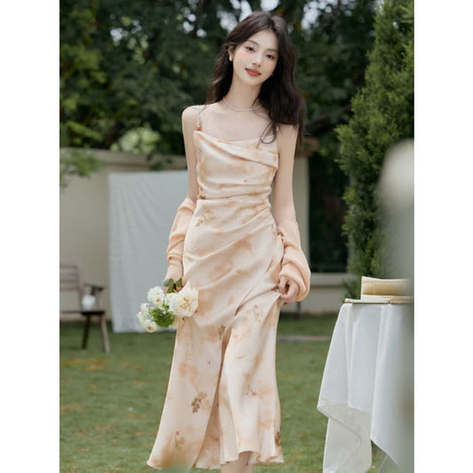 Gerafftes Maxi-Etuikleid mit Spaghettiträgern und Blumendruck / Schlichte Bolero-Strickjacke / Set