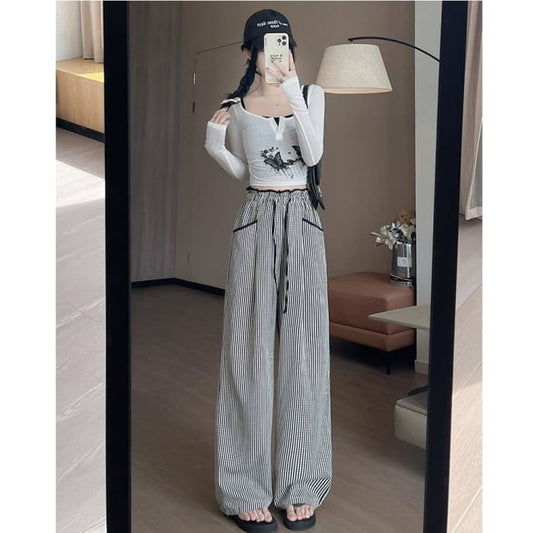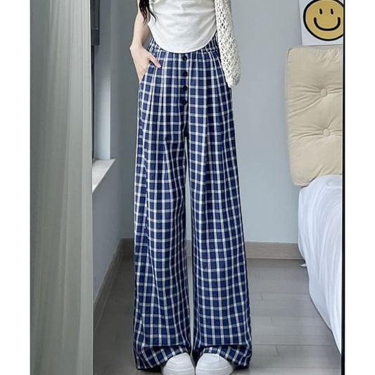 Karierte Hose mit weitem Bein und hoher Taille und Kordelzug