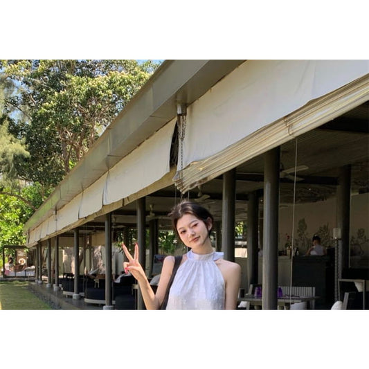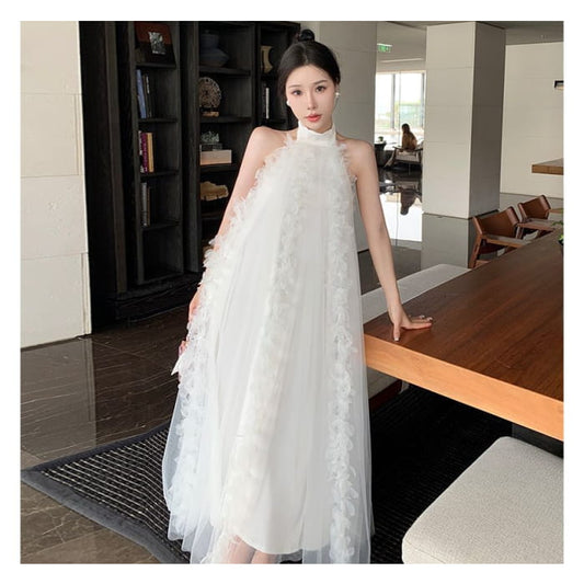 Neckholder-Maxi-Kittelkleid mit Rüschen und Netzeinsatz