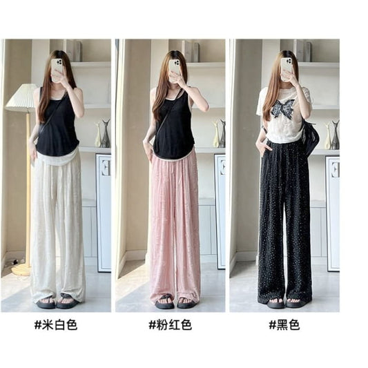 Hose mit weitem Bein, hoher Taille, zerrissenem Bein und Kordelzug und Strass-Applikationen