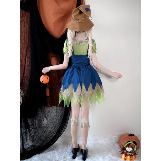 Halloween Vogelscheuchenkostüm mit grüner Bluse und blauem Kleid