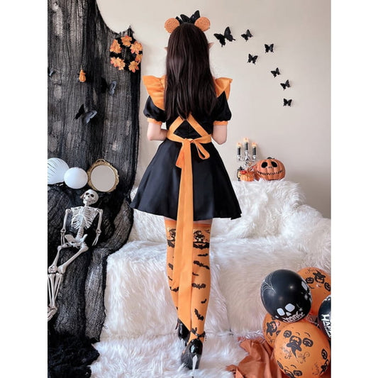 Halloween Kostüm für Dienstmädchen in Schwarz und Orange mit Kürbis-Muster