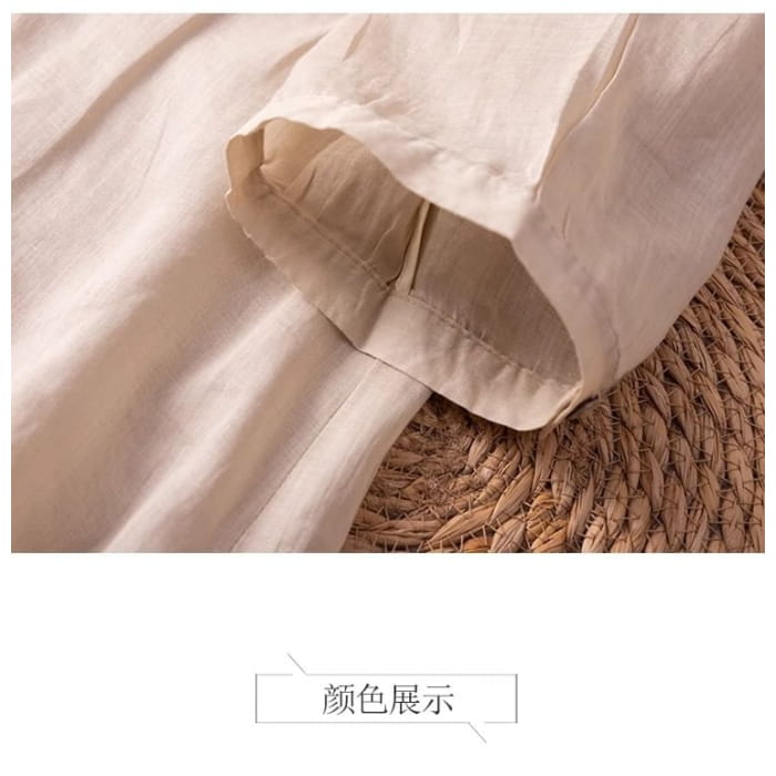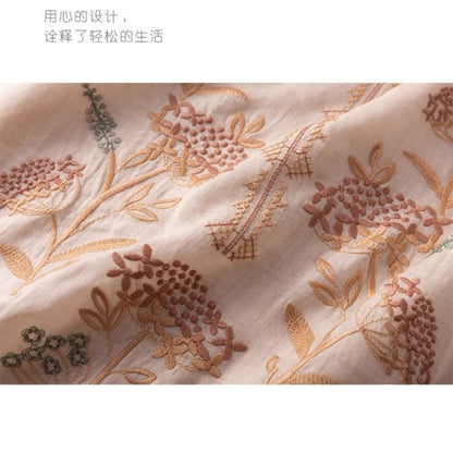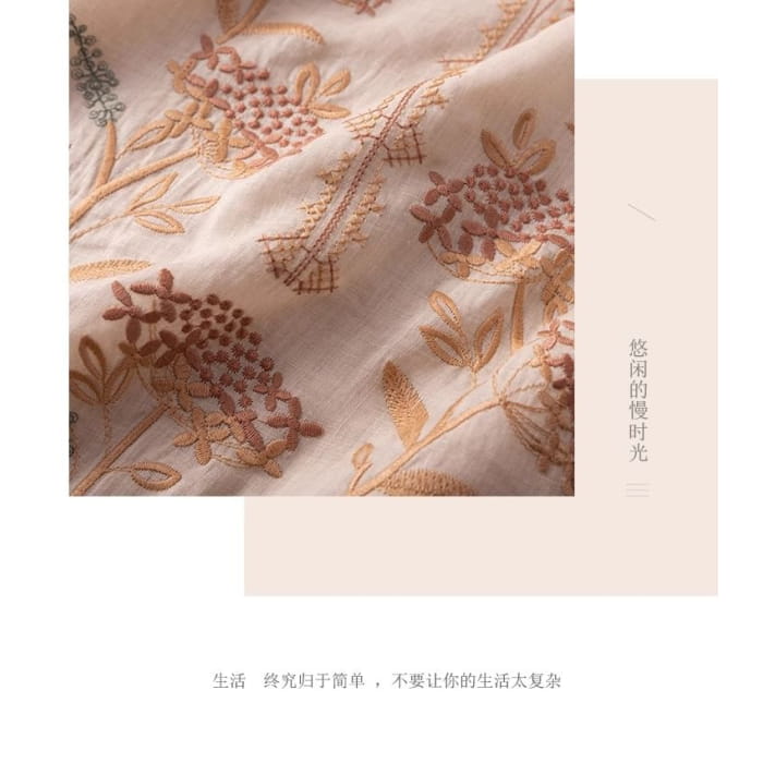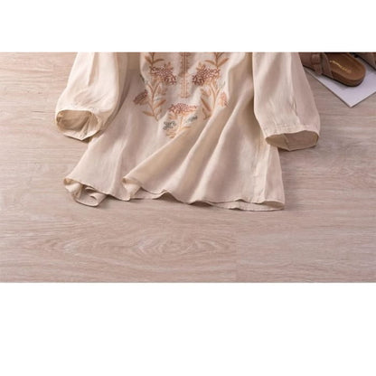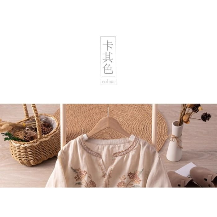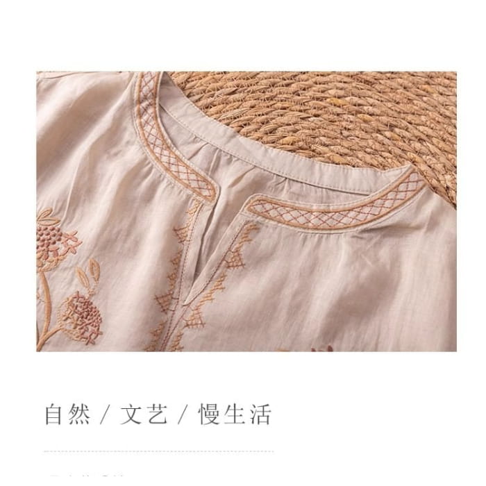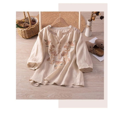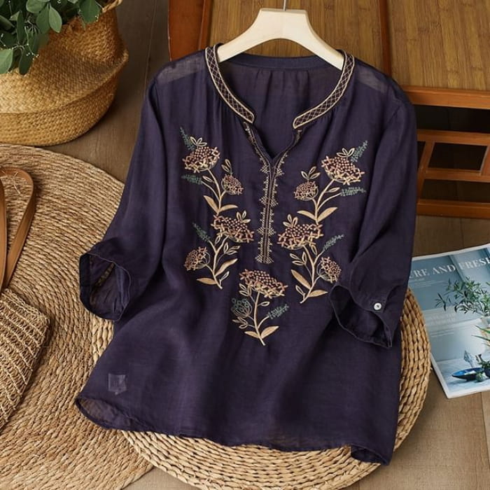 Leinenbluse mit 3/4-Ärmeln, Reverskragen und Blumenstickerei