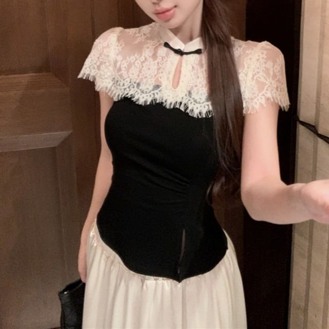 Short-Sleeve Two Tone Asymmetrical Top / High Waist Maxi A-Line Skirt