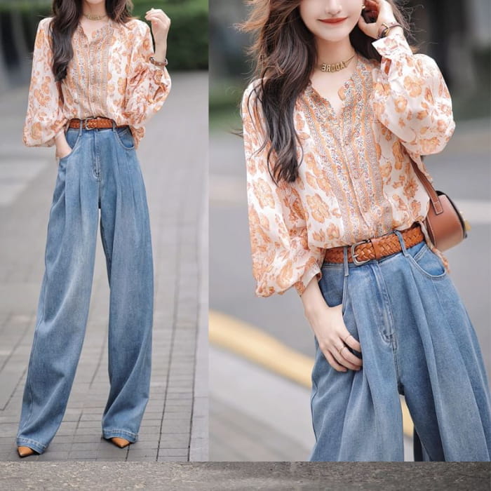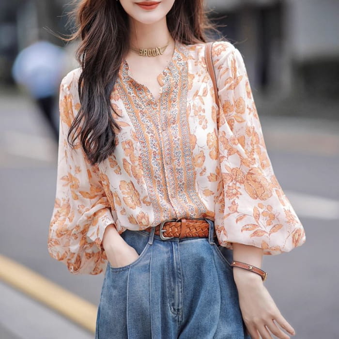 Bluse mit Ballonärmeln und Stehkragen und Blumenmuster