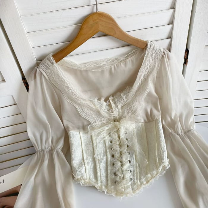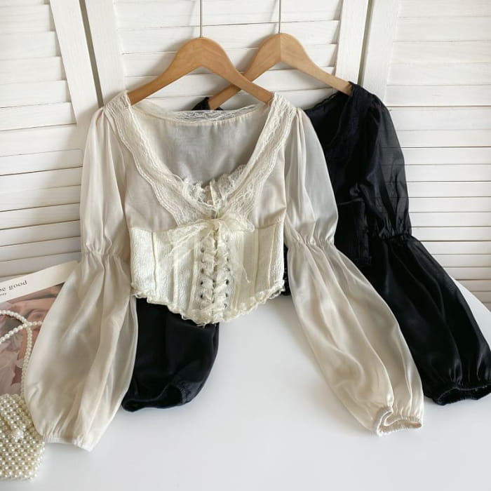 Bluse mit Spitzenbesatz, geradem Ausschnitt, Schnürung und Einsätzen
