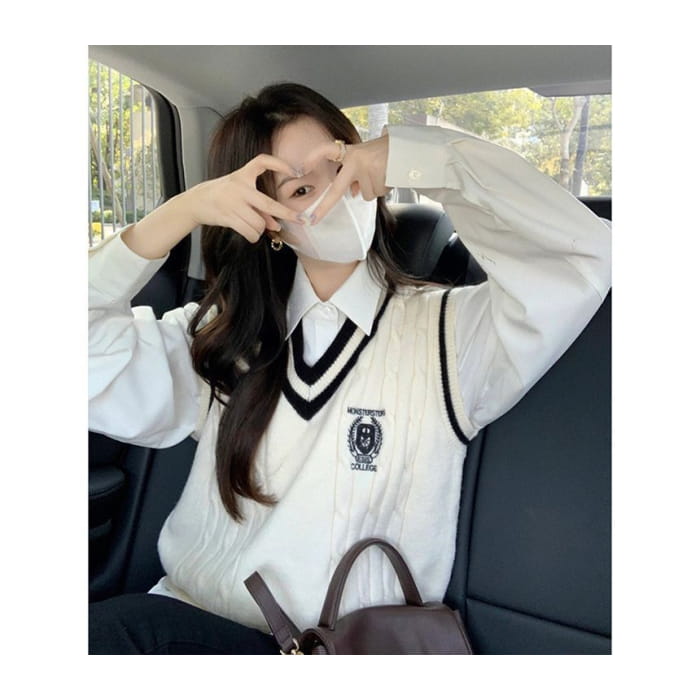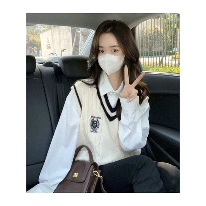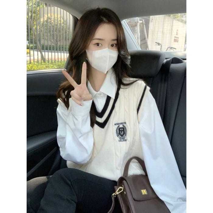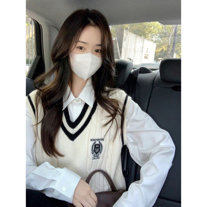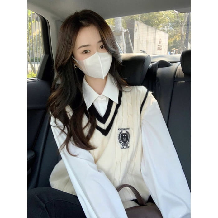 Einfarbiges Hemd mit Kragen / Pullunder mit V-Ausschnitt / Einfarbiger Mini-Faltenrock mit hoher Taille