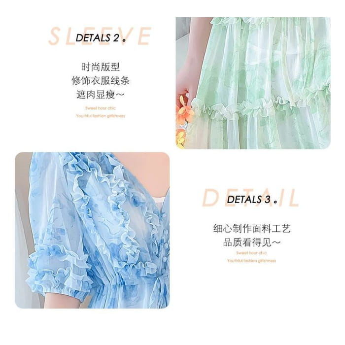 A-Linien-Kleid mit V-Ausschnitt, Blumendruck, Rüschen und Knopfleiste und Ellenbogenärmeln