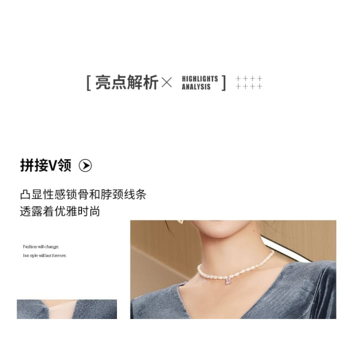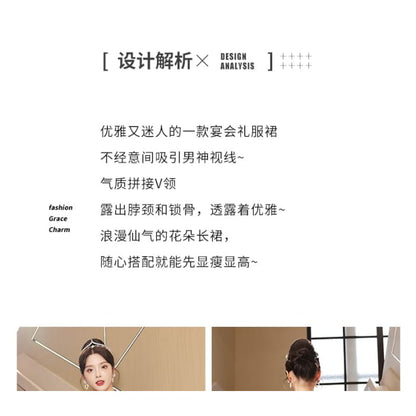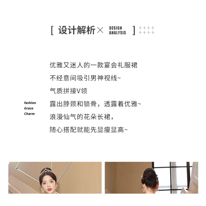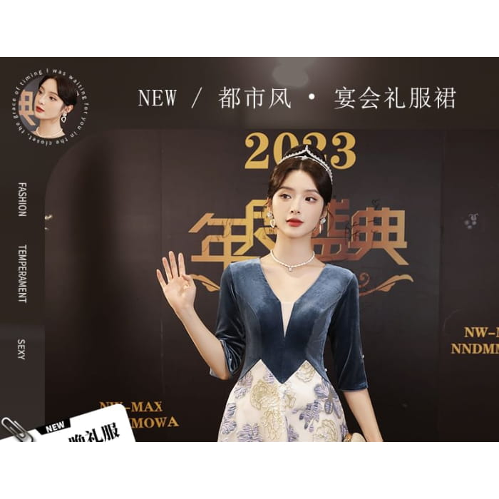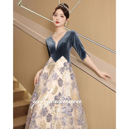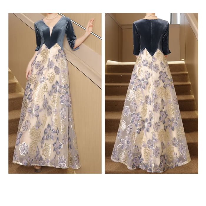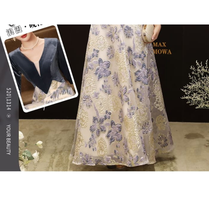 Abendkleid in A-Linie mit V-Ausschnitt, Samteinsatz und Jacquard-Netzstoff mit Blumenmuster und Ellenbogenärmeln