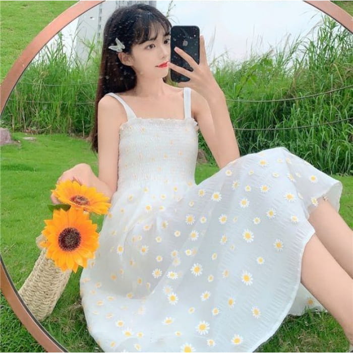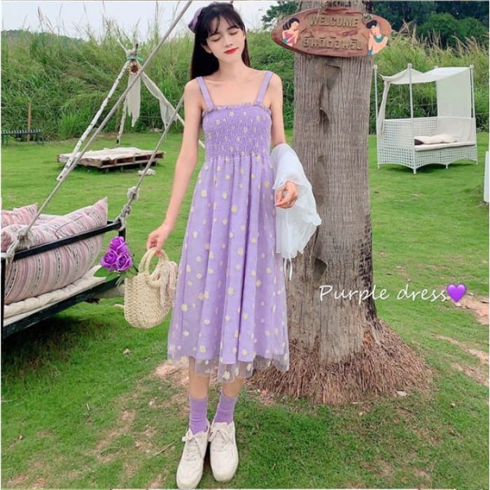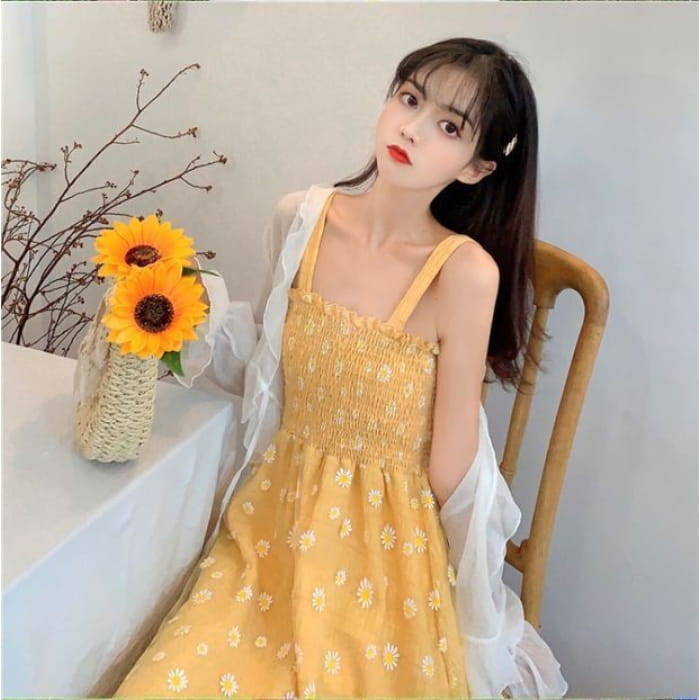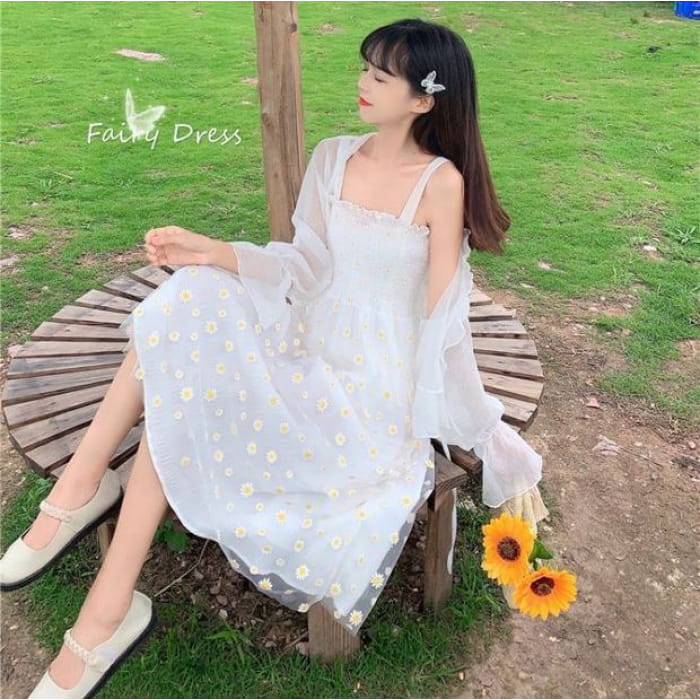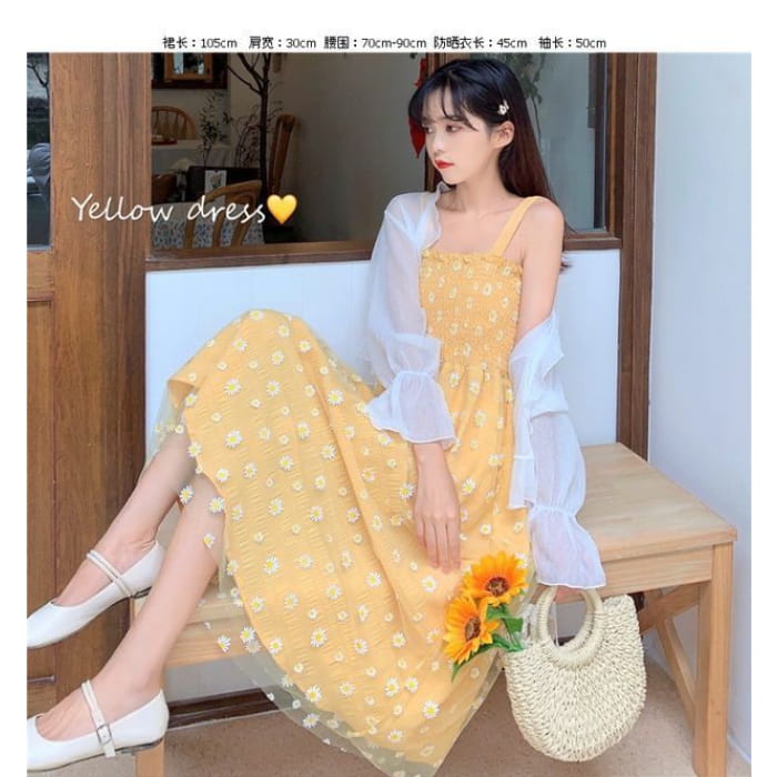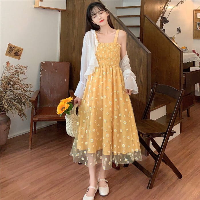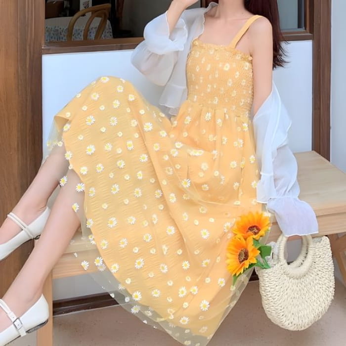 Geblümtes Midikleid mit Trägern und Netzüberzug / transparenter Cardigan zum Binden vorne